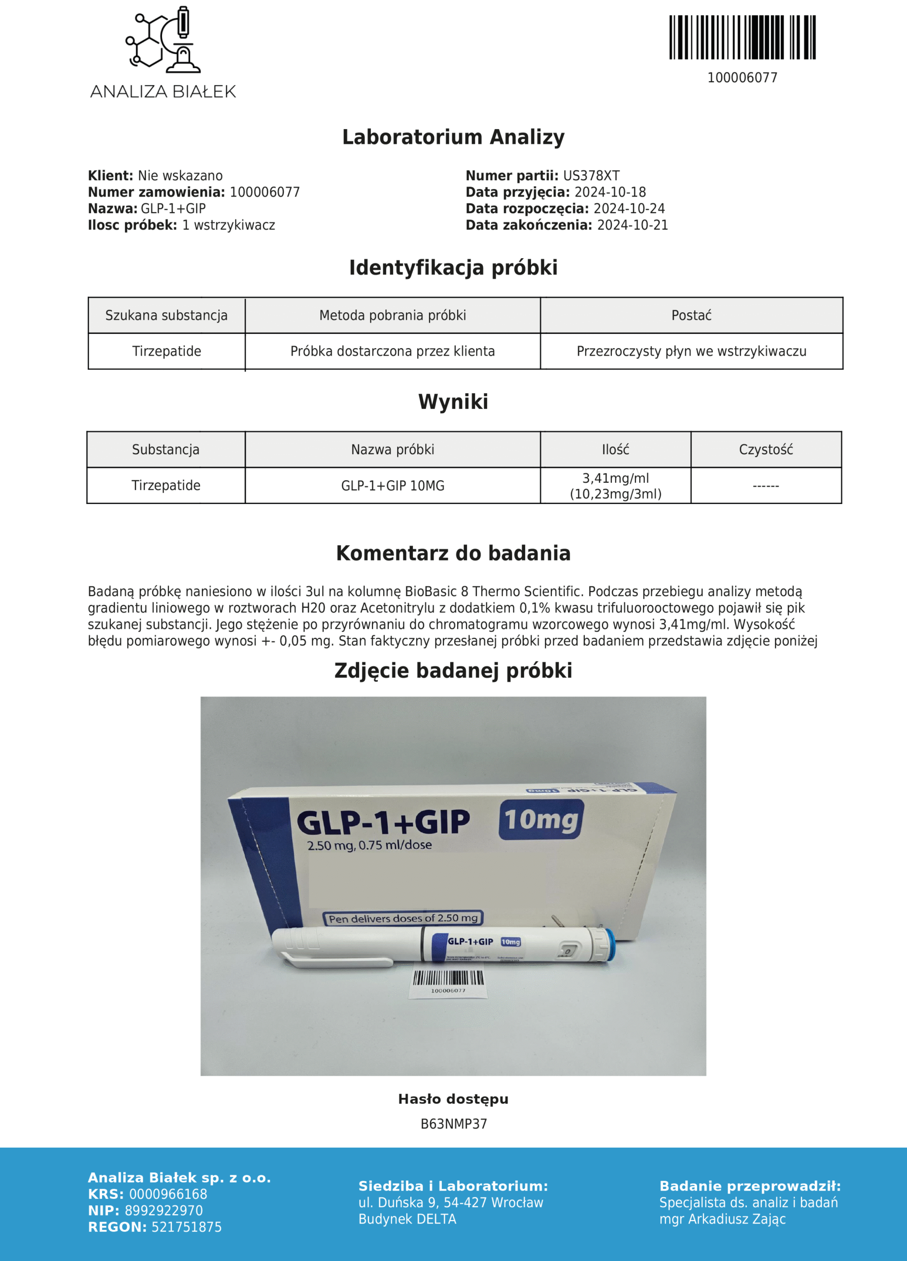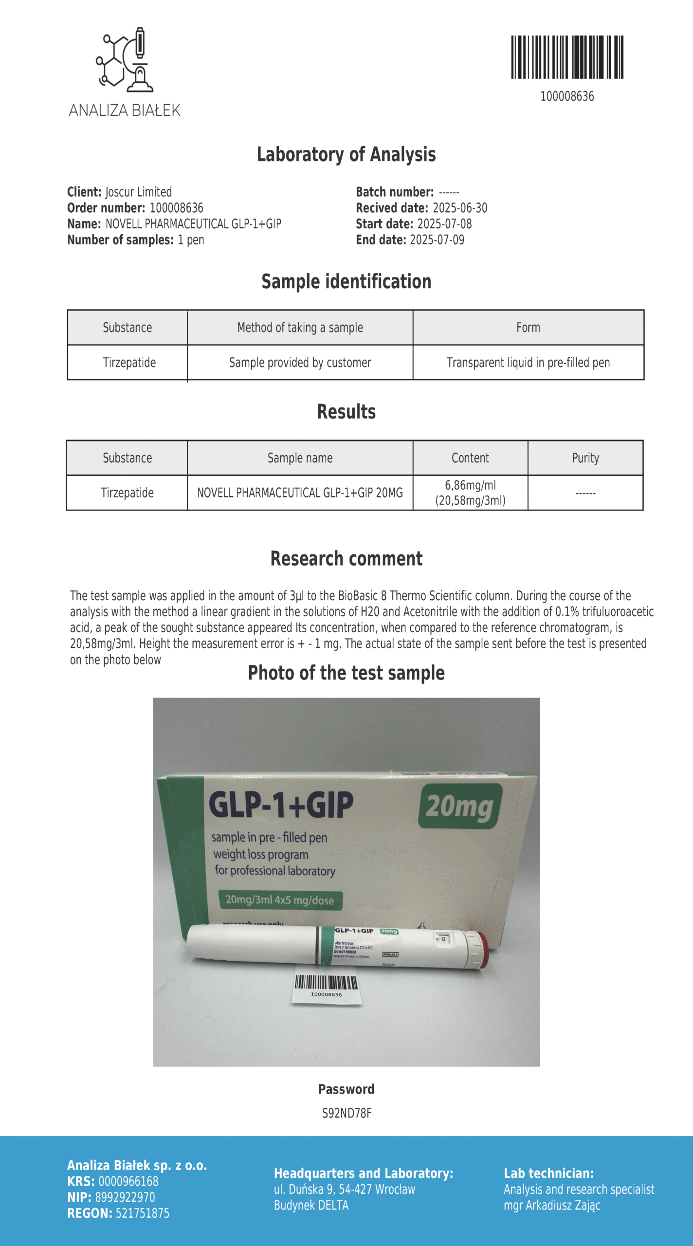 GLP-1+GIP składa się z sekwencji polipeptydowej liczącej do 42 aminokwasów. Jego specyficzna sekwencja aminokwasów to:
